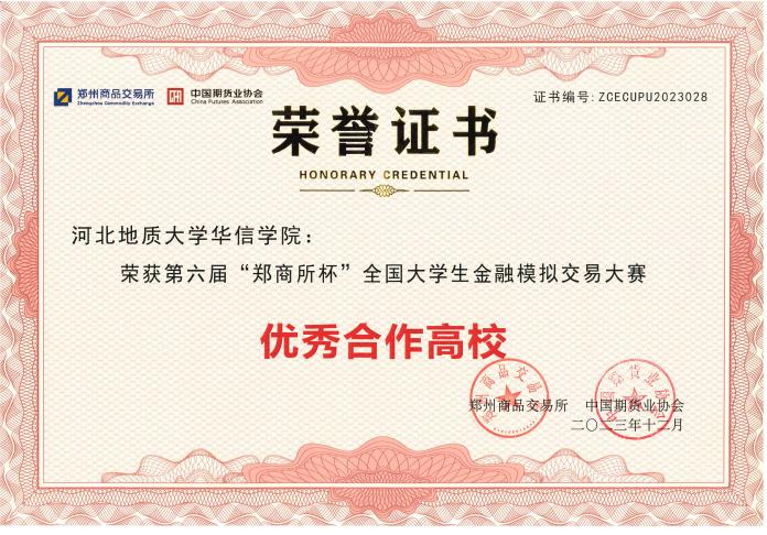 第六屆“鄭商所杯”全國大學(xué)生金融模擬交易大賽(簡稱:第六屆“鄭商所杯”)已經(jīng)圓滿收官。近日,第六屆“鄭商所杯”獲獎名單對外公示。國富農(nóng)業(yè)投資集團(tuán)所屬子公司恒銀期貨有限公司(簡稱:恒銀期貨)對接的高校——河北地質(zhì)大學(xué)華信學(xué)院榮獲第六屆“鄭商所杯”全國大學(xué)生金融模擬交易大賽“優(yōu)秀合作高校”稱號。