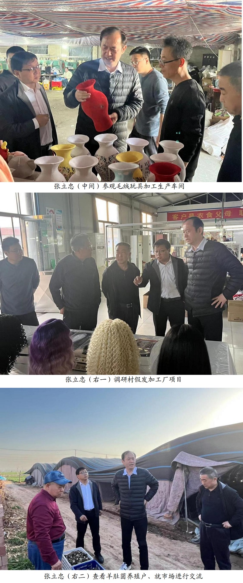 調(diào)研工作由曲周縣大河道鄉(xiāng)黨委書(shū)記王貴民陪同,參觀了毛絨玩具、假發(fā)加工車(chē)間和羊肚菌種植基地。會(huì)議中介紹了賈莊村當(dāng)前發(fā)展?fàn)顩r、存在問(wèn)題以及未來(lái)發(fā)展規(guī)劃。下沉工作隊(duì)隊(duì)長(zhǎng)齊連洪匯報(bào)了工作隊(duì)近期走訪調(diào)研及項(xiàng)目謀劃的工作進(jìn)展和下一步工作打算。