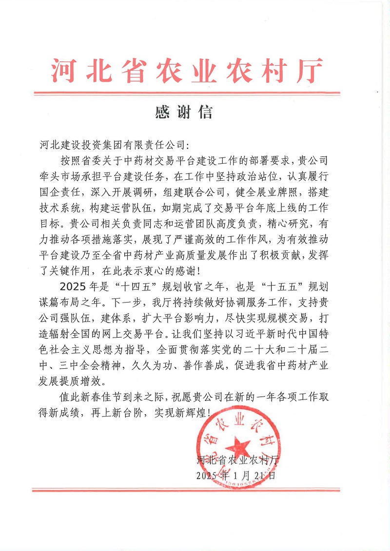 近日,河北省農(nóng)業(yè)農(nóng)村廳向河北建投集團(tuán)發(fā)來(lái)感謝信,高度贊揚(yáng)河北建投集團(tuán)在河北省中藥材交易平臺(tái)建設(shè)工作中所展現(xiàn)出的責(zé)任擔(dān)當(dāng)與卓越貢獻(xiàn)。